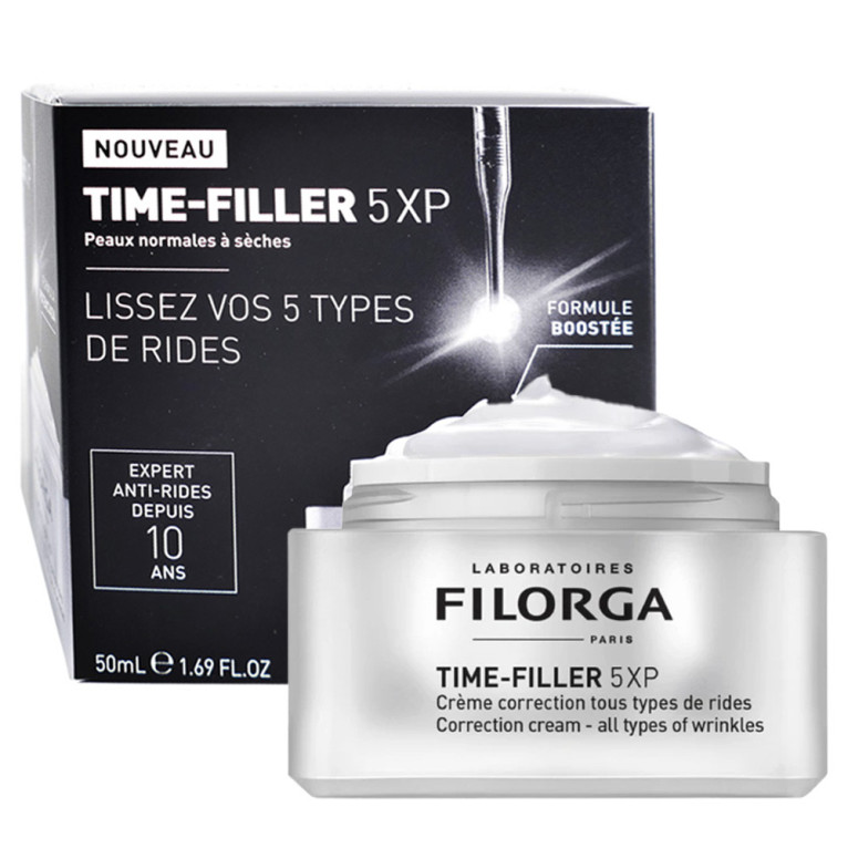 TIME FILLER 5XP de FILORGA, est une crème qui va réduire visiblement les 5 types de rides (Rides d’expression, Rides profondes, Rides de surface, Rides de dessèchement, Rides du cou).