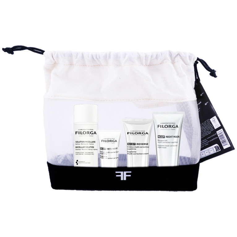 La Trousse « NCEF » discount de FILORGA 4 soins Multi-correction inspirés de la médecine esthétique réunis dans une trousse aux vertus anti-âge puissantes dans votre parapharmacie en ligne à prix discount, pour corriger les signes de l’âge et redonner un visage lumineux et une peau rajeunie et raffermit. : Solution Micellaire (50ml), NCEF-INTENSIVE Sérum Multi-correcteur Suprême (30ml), NCEF-REVERSE Crème Multi-correctrice Suprême (15ml), NCEF Night Mask (15ml). Visage