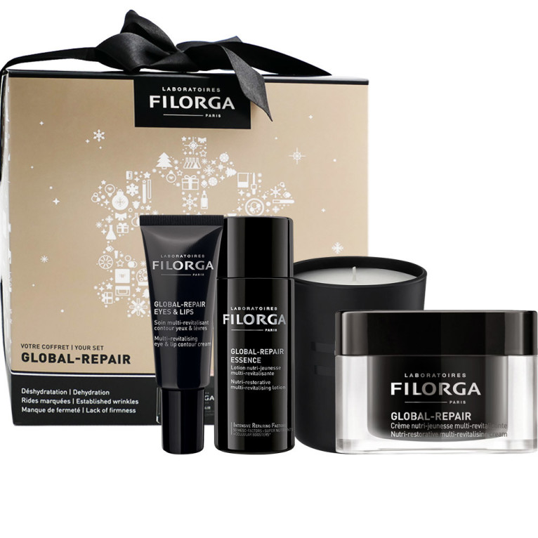 Le Coffret « Global Repair discount des Laboratoires FILORGA, 2 soins anti-âge revitalisants réunis spécialement conçu pour les peaux dévitalisées dans votre parapharmacie en ligne à prix discount. Visage ; Contour des yeux et des lèvres. Peaux dévitalisées Crème Global-Repair (50ml) ; Sérum Global-Repair Essence (50ml) ; Soin Global-Repair Eyes&Lips (4ml). Avec bougie