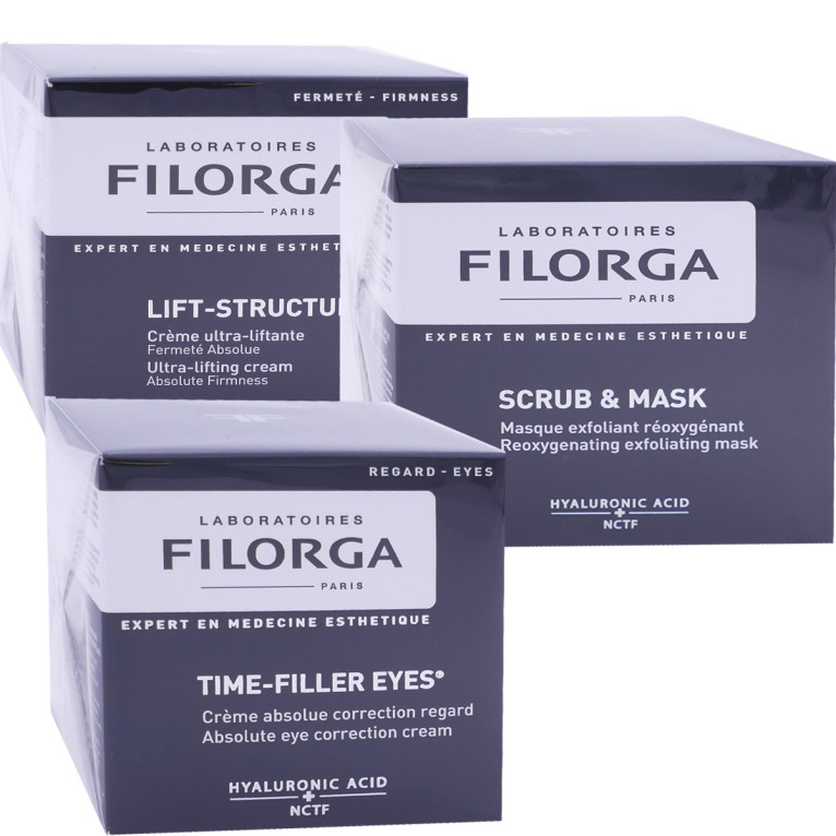 Le pack de FILORGA dans votre parapharmacie en ligne à prix discount, 3 soins inspirés de la médecine esthétique aux vertus anti-âge puissantes et liftants pour lutter contre les rides, et redonner de l’éclat au visage et au regard : Lift-Structure (50ml), Scrub & Mask (55ml), Time Filler Eyes (15ml). Visage et contour des yeux