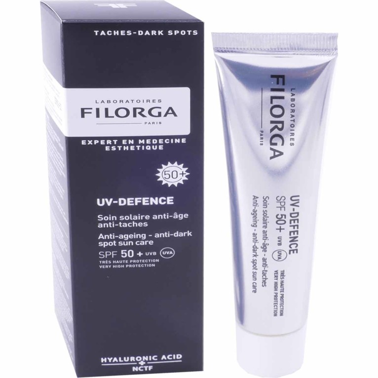 FILORGA, fort d’une expérience reconnue dans le traitement du vieillissement cutané depuis plus de 40 ans, a donné naissance à la toute première gamme française de soins cosmétiques inspirés de la médecine esthétique : des soins qui associe efficacité technique et dimension plaisir. UV-DEFENCE est un soin solaire anti-âge et anti-taches à base d’actifs hautement protecteurs : filtres solaires, vitamine E, extrait de houblon et algue brune, complexe acide hyaluronique et NCTF. Il estompe les taches cutanées sur le visage en diminuant et régulant la production de mélanine cutanée responsable de l’apparition de taches, protège de l’apparition de nouvelles taches induites par le stress oxydatif et les rayons UV, et régénéère la peau pour diminuer les signes de l’âge (rides et ridules). Sa texture facile à appliquer fond sur la peau pour laisser un fini non collant et non gras. Jour après jour les taches sont nettement moins visibles, la peau est plus forte et uniformisée, le teint lumineux.