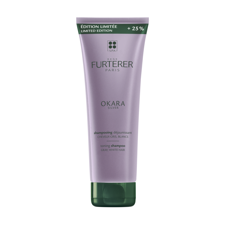 Après 60 ans de délices capillaires, l’aventure René Furterer s’appuie sur une conviction : la botanique regorge de vertus essentielles pour redonner aux cheveux leur force et leur beauté originelle. René Furterer est le premier à créer des soins végétaux hyper efficaces, sensoriels en sélectionnant des huiles essentielles rares et précieuses. Concentré en pigments correcteurs violets, le shampooing lave en douceur et neutralise immédiatement les reflets jaunes indésirables, pour sublimer la beauté des cheveux gris, blancs ou blond platine. Grâce à l’'extrait d'origine naturelle d'Okara riche en acides aminés similaires à ceux de la kératine, le shampoing OKARA SILVER favorise la réparation des cheveux fragilisés et sa texture dévoile une mousse onctueuse et généreuse, au parfum fleuri et raffiné. L’essayer c’est l’adopter ! Formulé sans silicone.
