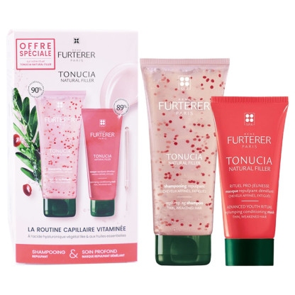 TONUCIA Natural Filler « La Routine Capillaire Vitaminée » discount de René FURTERER, le rituel de beauté capillaire, pour offrir 2 véritables soins fortifiant aux cheveux affinés fatigués dans votre parapharmacie en ligne à prix discount. Shampooing repulpant (200ml) et Masque Repulpant Démêlant (100ml).