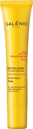 Depuis 1978, GALENIC offre le meilleur de la nature à travers sa connaissance approfondie de la physiologie cutané, et développe des produits dermo-cosmétiques haut de gamme pour accompagner les femmes exigeantes dans leur quête de beauté. La collection soins soleil propose des rituels de soins protecteurs aux textures légères délicieusement parfumées, pour profiter des bienfaits du soleil en toute sécurité. Ces soins sont composés d’un actif végétal au pouvoir photo-protecteur incomparable, l’Uncaria d’Amazonie, combiné à des filtres protecteurs stables et efficaces. Soins soleil crème légère SPF50+ de GALENIC, à la texture légère et invisible qui pénètre la peau sans effet de gras, est spécialement conçue pour protéger intensément le visage des peaux claires et sensibles, procurer douceur et confort à la peau, luminosité au bronzage.