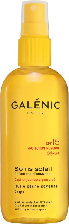 Depuis 1978, GALENIC offre le meilleur de la nature à travers sa connaissance approfondie de la physiologie cutané, et développe des produits dermo-cosmétiques haut de gamme pour accompagner les femmes exigeantes dans leur quête de beauté. La collection soins soleil propose des rituels de soins protecteurs aux textures légères délicieusement parfumées, pour profiter des bienfaits du soleil en toute sécurité. Ces soins sont composés d’un actif végétal au pouvoir photo-protecteur incomparable, l’Uncaria d’Amazonie, combiné à des filtres protecteurs stables et efficaces. Soins soleil huile sèche soyeuse SPF15 de GALENIC, à la texture fine et non grasse, est spécialement conçue pour protéger les peaux mates et déjà bronzées, procurer douceur et confort à la peau, luminosité au bronzage.