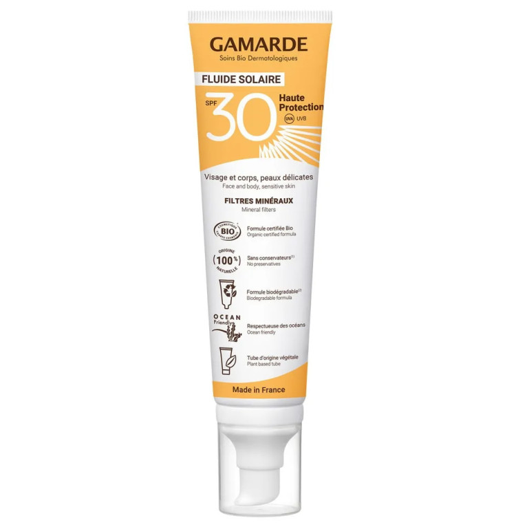 Fluide Solaire SPF 30 haute protection discount de GAMARDE Solaire, la beauté certifiée BIO d’origine naturelle dans votre parapharmacie en ligne à prix discount, dans un soin conçu pour protéger la peau claire et lutter contre méfaits du soleil. Visage et corps