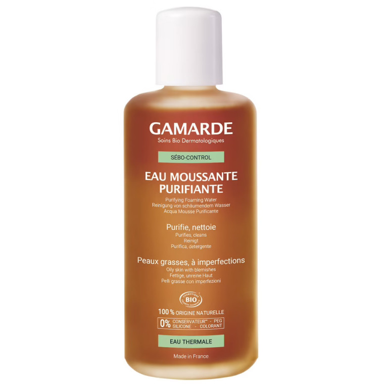 Sébo-control eau moussante purifiante de GAMARDE, la beauté certifiée BIO d’origine naturelle dans un soin conçu pour nettoyer sans dessécher, équilibrer et purifier les peaux grasses sujettes aux imperfections.