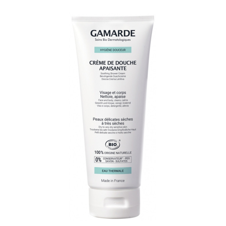 Crème de douche apaisante de GAMARDE, la beauté certifiée BIO d’origine naturelle dans un soin conçu pour nettoyer en douceur, nourrir, apaiser et rétablir le confort des peaux sèches délicates.