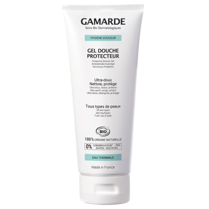 Gel douche protecteur de GAMARDE, la beauté certifiée BIO d’origine naturelle dans un soin conçu pour nettoyer en douceur sans dessécher, tonifier et énergiser la peau.