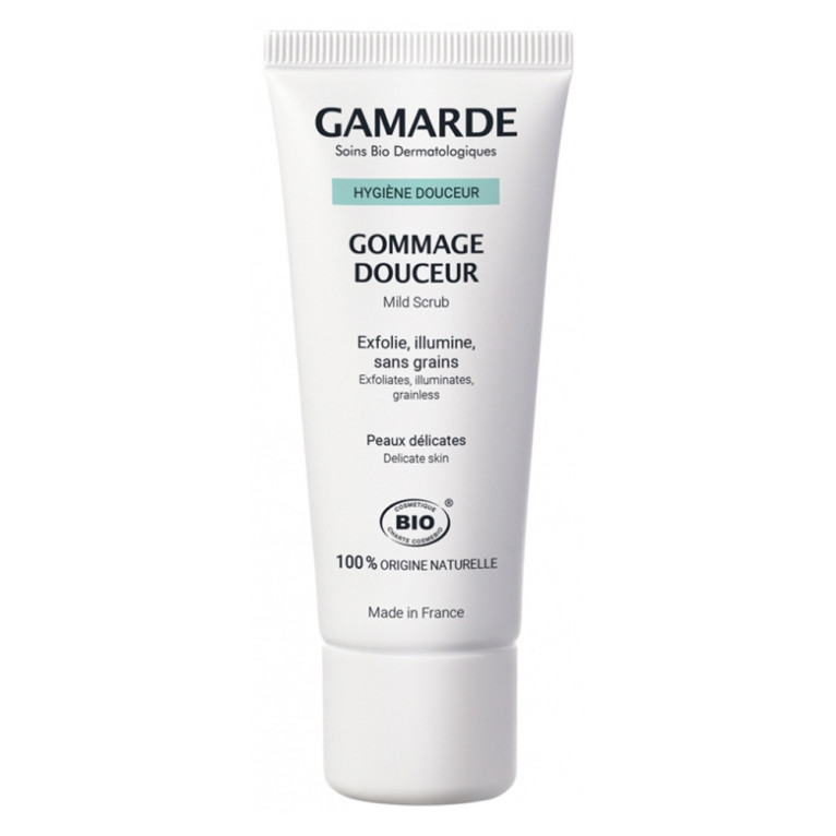 Le gommage douceur de GAMARDE, la beauté certifiée BIO d’origine naturelle dans un soin conçu pour offrir un effet peau neuve aux épidermes les plus délicats, visage.