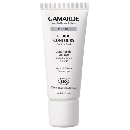 Près-âge fluide contours de GAMARDE, la beauté certifiée BIO d’origine naturelle dans un soin conçu pour nourrir et tonifier les zones fragiles du visage : contours des yeux et des lèvres.