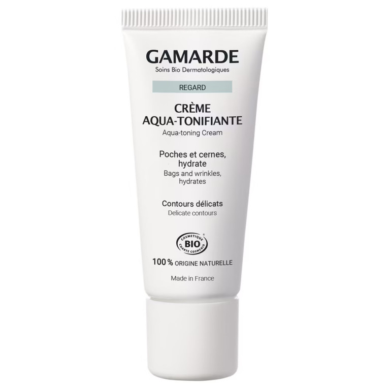 Les Laboratoires Dermatologiques Gamarde développent des soin dermocosmétiques certifiés Bio, aux formules d’origine naturelle qui combinent les vertus dermatologiques de l’Eau de Gamarde-les-Bains et les propriétés précieuses de l’huile d’Argan bio, pour répondre aux besoins des peaux sensibles de toute la famille. La gamme Soins regard de GAMARDE est composée de soins à base d'actifs naturels BIO 100% d’origine naturelle pour redonner au regard fatigué lumière et fraîcheur.La Crème Aqua-tonifiante regard estompe les cernes et les poches sous les yeux en décongestionnant, hydrate intensément en redonnant de l’élasticité à la peau sur le contour de l’œil et apaise de tout inconforts, grâce au complexe Perfecteur Regard Gamarde, à l’acide hyaluronique d’origine végétale, à l’aloe vera, et à l’eau thermale de Gamarde. Dès l’application, le regard est frais et retrouve toute sa lumière, la peau est douce et apaisée.