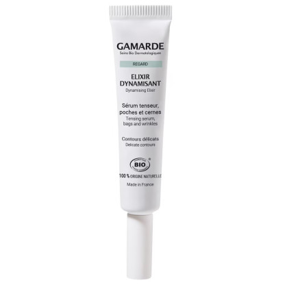 La gamme Soins regard de GAMARDE est composée de soins à base d'actifs naturels BIO 100% d’origine naturelle pour redonner au regard fatigué lumière et fraîcheur. L’Elixir dynamisant regard estompe les cernes et les poches sous les