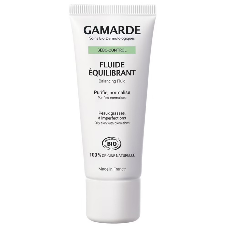 Sébo-control fluide équilibrant de GAMARDE, la beauté certifiée BIO d’origine naturelle dans un soin conçu pour matifier, affiner le grain et réduire les imperfections des peaux grasses.
