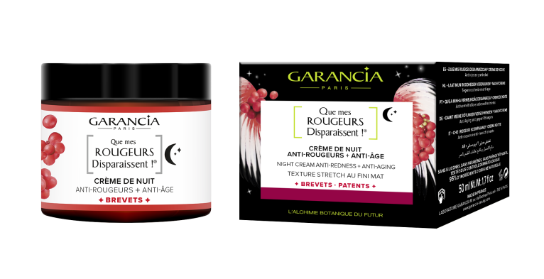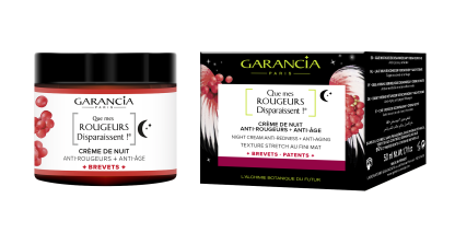 GARANCIA développe des produits dermo-cosmétiques uniques, qui allient ingrédients botaniques traditionnels, nouvelles technologies, rituels de beauté modernes et anciens, pour offrir aux femmes exigeantes des soins d’une rare efficacité, enveloppés d’un univers de magie. Que mes rougeurs disparaissent ! Nuit de GARANCIA, est une crème concentré de beauté magique qui efface d’un coup de baguette les rougeurs inesthétiques du visage et lutte contre les signes de l’âge. Sa formule magique, l’ANTIRECIDIVOX, combine un ferment riche en zinc et 5 extraits botaniques associés à une microalgue verte (chlorella vulgaris) et des baies de Schissandra qui atténue les rougeurs en luttant contre leur réapparition, diminue les rides et raffermit la peau. Ce soin contient également un extrait du fruit du Mangoustan et de l’écorce de magnolia aux pouvoirs calmants et apaisant, et du beurre de karité bio qui nourrit et hydrate la peau. Sa texture inédite strech procure instantanément une peau rebondie et un fini mat par ses grains de kaolin fondants. En agissant pendant la phase nocturne, les rougeurs sont diminuées, l’apparence des petits vaisseaux en forme d’araignée est atténuée. Testé sous contrôle dermatologique. Sans paraben, sans phenoxyethanol, sans silicones.