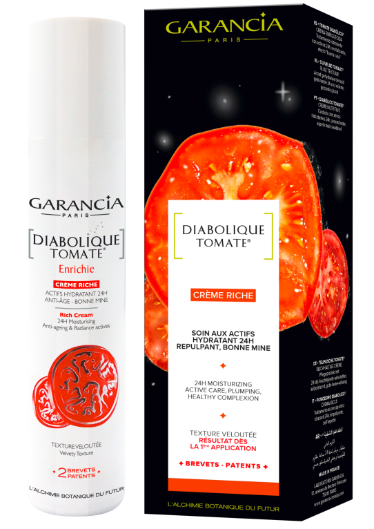 GARANCIA développe des produits dermo-cosmétiques uniques, qui allient ingrédients botaniques traditionnels, nouvelles technologies, rituels de beauté modernes et anciens, pour offrir aux femmes exigeantes des soins d’une rare efficacité, enveloppés d’un univers de magie. Diabolique tomate enrichie de GARANCIA, est une crème magique à la texture généreuse, naturellement colorée qui se transforme au contact de la peau en eau gorgée d’actifs ultra-hydratants, anti-âge et bonne-mine. Sa formule magique combine un extrait oléomoléculaire réactivateur de l’hydratation naturelle de la peau, 6 extraits botaniques : un extrait de Sang Dragon véritable pansement botanique pour la peau, un extrait de pulpe de tomate riche en lycopène antioxydant qui procure sa couleur orangée au produit et un effet bonne mine à la peau, un extrait de riz hydratant, un extrait d’algue Ulva Lactuca aux pouvoirs anti-rides et raffermissants, du beurre de karité bio nourrissant et hydratant, un extrait de jus de citron frais bio astringent et éclaircissant, des cires de jojoba et candelilla aux propriétés hydratantes et filmogènes. Résultat La peau est hydratée en profondeur tout au long de la journée et repulpée, le teint est délicieusement rosé.