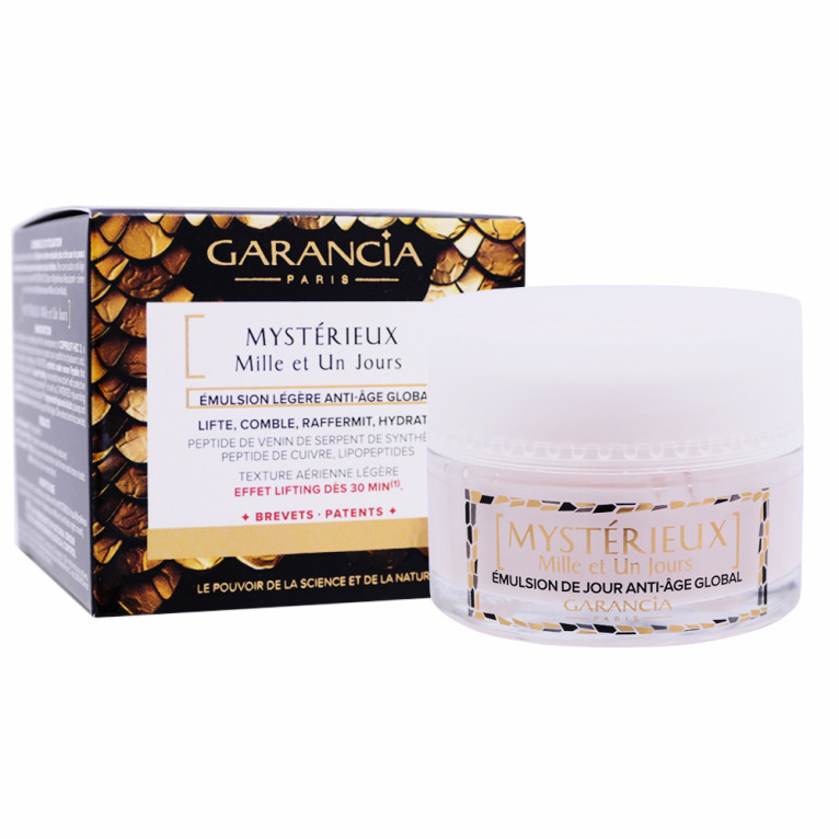 GARANCIA développe des produits dermo-cosmétiques uniques, qui allient ingrédients botaniques traditionnels, nouvelles technologies, rituels de beauté modernes et anciens, pour offrir aux femmes exigeantes des soins d’une rare efficacité, enveloppés d’un univers de magie.Mystérieux mille et un jours émulsion de GARANCIA, à la texture légère qui assure un effet mat sans brillance aux peaux mixtes à grasses, est un véritable soin de jouvence qui va métamorphoser la qualité de la peau en quelques semaines. GARANCIA a conçu ce trésor de jeunesse en associant les travaux d’un laboratoire Français spécialisé dans la recherche des mécanismes de défenses des algues soumises au stress de leur environnement, et d’un laboratoire suisse spécialisé dans les propriétés pharmaceutiques du venin de serpent. GARANCIA a ainsi créé un complexe unique Progerlift, qui combine les pouvoirs rajeunissants de l’algue Alaria Esculenta, les propriétés liftantes de la pulpe de fougère, les vertus hautement hydratantes de l’acide hyaluronique fragmenté, un Lipopeptide de jeunesse, et un dérivé d’Olive nourrissante. De cette formule magique est née un soin unique, capable de réduire jusqu’à les rides, raffermir la peau, redessiner les contours du visage et rétablir une seconde jeunesse au visage.