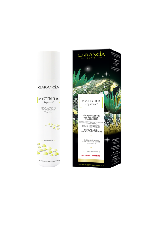 GARANCIA développe des produits dermo-cosmétiques uniques, qui allient ingrédients botaniques traditionnels, nouvelles technologies, rituels de beauté modernes et anciens, pour offrir aux femmes exigeantes des soins d’une rare efficacité, enveloppés d’un univers de magie. Mystérieux Repulpant sérum de GARANCIA, est un véritable soin de jouvence qui va métamorphoser la qualité de la peau en quelques semaines. GARANCIA a conçu ce trésor de jeunesse en collaborant avec un laboratoire suisse spécialisé dans les propriétés pharmaceutiques du venin de serpent. GARANCIA a ainsi créé un complexe unique SpeedRlaxe®qui combine les pouvoirs réparateurs de l’aloe véra, les propriétés lissantes de l’Acmella Oleracéa et du bourgeon de hêtre, les vertus hautement hydratantes de l’acide hyaluronique, un extrait de jus de citron frais astringent et tonifiant, un extrait de Mélilo fortifiant et décongestionnant, de l’arnica anti-bleus et adoucissant, un tétrapeptide anti-poches/ anti-cernes et un peptide de venin de serpent. De cette formule magique est née un soin unique, capable de réduire jusqu’à 41% de réduction des rides en 28 jours d’application, repulper la peau, réveiller le regard et rétablir une seconde jeunesse au visage.