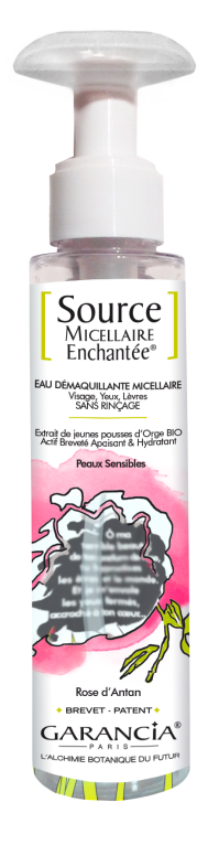 GARANCIA développe des produits dermo-cosmétiques uniques, qui allient ingrédients botaniques traditionnels, nouvelles technologies, rituels de beauté modernes et anciens, pour offrir aux femmes exigeantes des soins d’une rare efficacité, enveloppés d’un univers de magie. Source Micellaire Enchantée Rose d’antan de GARANCIA, est le soin qui va transformer le démaquillage en pur moment de plaisir. Cette eau micellaire est spécialement conçue pour nettoyer et démaquiller les peaux sensibles : visage, yeux et lèvres, hydrater, apaiser et illuminer le teint. Sa formule magique associe un extrait de jeunes pousses d’Orge vertes BIO riche en polyphénols aux propriétés antioxydantes et un actif breveté hydratant et apaisant qui réduit significativement les sensations d’inconfort. Sans parabènes, sans phénoxyéthanol, 96,8 % d’ingrédients d’origine naturelle, testé sous contrôle dermatologique et ophtalmologique sur peaux et yeux sensibles dont porteurs de lentilles.