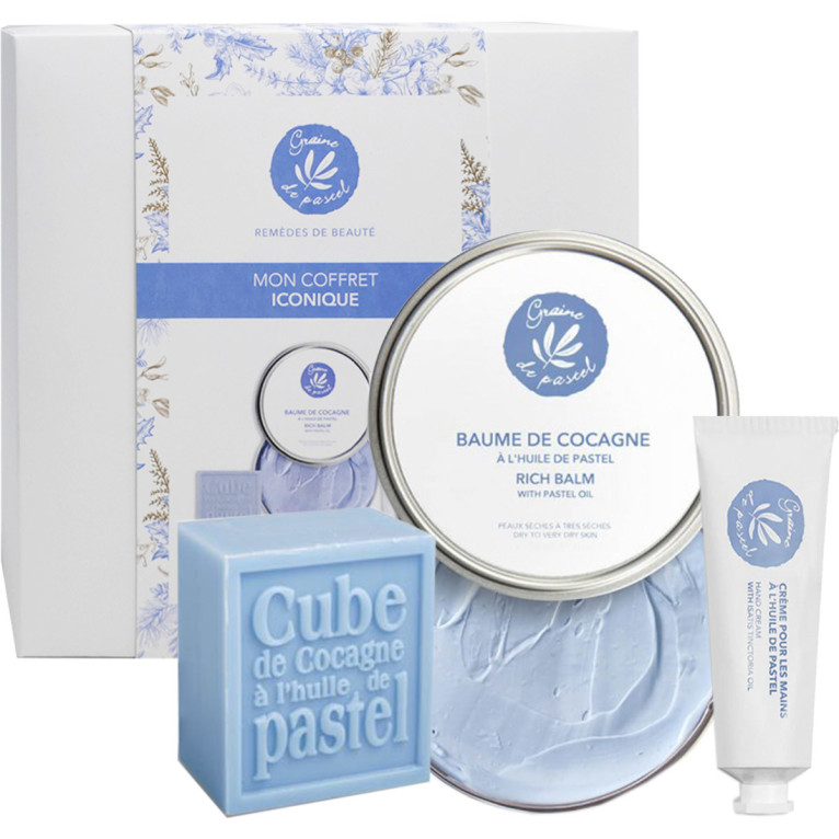 Le Coffret « Mon Coffret Iconique » discount de GRAINE DE PASTEL, 3 soins naturels iconiques aux textures et fragrances addictives réunis dans un coffret à offrir ou à se faire offrir ! Dans votre parapharmacie en ligne à prix discount. Corps Baume de Cocagne (200 ml), Crème pour les Mains (30 ml), Cube de Cocagne (125g)