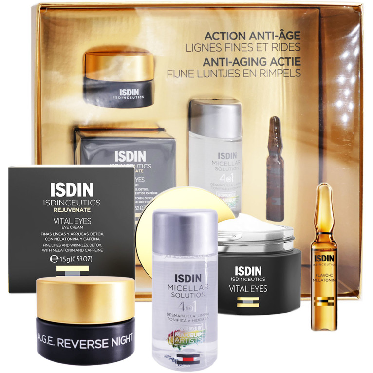 Le Coffret « Action Anti-âge » ISDINCEUTICS discount des laboratoires ISDIN, 4 produits destinés à préserver la beauté et la jeunesse de la peau et du regard, dans votre parapharmacie en ligne à prix discount. Eau Micellaire (30ml) ; Flavo-C Melatonin Sérum Réparateur Nuit (2ml) ; A.G.E. Reverse Night Crème Réparatrice Nocturne (7ml) ; Rejuvenate Vital Eyes Crème Contour des Yeux (15g). Visage, Contour des Yeux