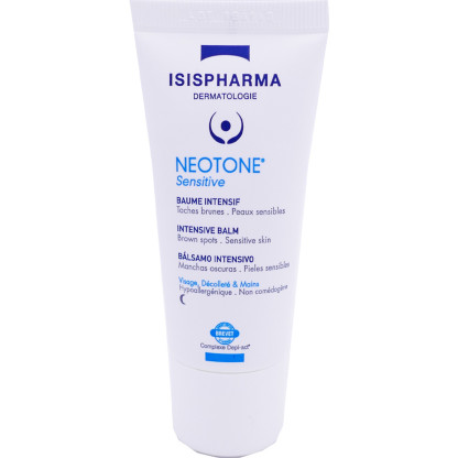 Le Baume Intensif Taches Brunes NEOTONE Sensitive discount des laboratoires ISISPHARMA, la dermatologie à la portée de tous dans votre parapharmacie en ligne à prix discount, dans un soin nocturne qui unifie le teint et estompe les taches du visage, du décolleté et des mains rapidement. Pour peaux sensibles