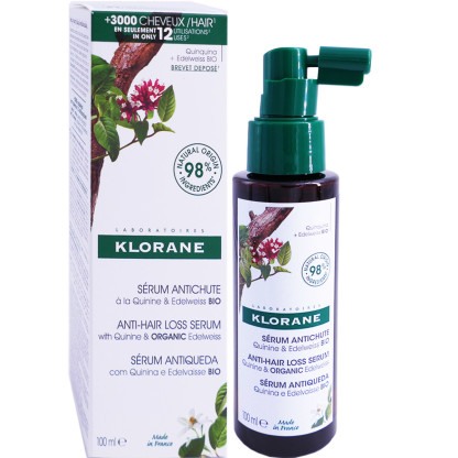 Serum Antichute de KLORANE, qui ne nécessite pas de rinçage, laisse les cheveux faciles à coiffer, est composée de quinine fortifiante dont l’action est potentialisée par de l'Eldelweiss bio, de la caféine, du manganèse et des vitamines B aux propriétés antichute. L’utilisation de ce soin réactive la croissance des cheveux et freine leur chute. Les cheveux retrouvent force et vigueur en 1 mois. En 3 mois, les cheveux retrouvent leur densité. Testé sous contrôle dermatologique - sans paraben.