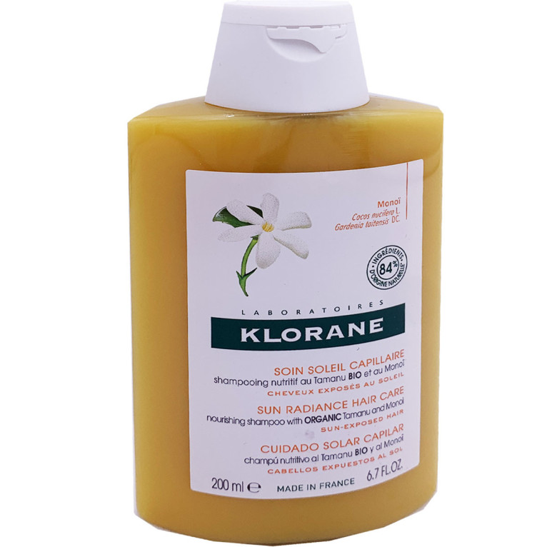 Le laboratoire Klorane propose des produits fabriqués en France à partir d’ingrédients botaniques rigoureusement sélectionnés. 100% des cultures des actifs végétaux utilisés par le laboratoire n'impactent pas le renouvellement de la plante. Le laboratoire Klorane s’engage à réduire l’impact de ses formules et emballages : 1 produit Klorane sur 2 est écoconçu. Le shampooing solaire Klorane est composé d’huile de Tamanu qui hydrate et redonne de l’éclat et de la brillance aux cheveux agressés par le soleil ; et de monoï qui pour les cheveux secs, voire très secs permet de les hydrater en profondeur.