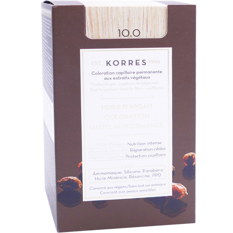 Le laboratoire KORRES conçoit des produits de beauté (cosmétiques, maquillage, crèmes,…), des parfums et des produits homéopathiques pour le bien-être au quotidien à base exclusivement de plantes et ingrédients naturels. La gamme de Colorations permanentes est spécialement conçue pour couvrir en totalité les cheveux blancs en une application, et offrir une brillance extrême longue durée. Les colorations KORRES sont formulées sans ammoniaque, sans résorcine, sans p-phénylènediamine (PPD) ni paraben et respectent intensément la nature du cheveu et le cuir chevelu. Elles contiennent de l’huile d’argan et de la kératine naturelle protectrices qui préservent durablement la couleur et l’hydratation du cheveu en renforçant la fibre capillaire, afin de protéger des agressions quotidiennes. Les colorations ont été conçues avec la technologie « capture de pigment » qui va fixer la couleur au cœur de la fibre capillaire grâce à des micro-colorant qui sont encapsulés pour former des macromolécules de couleur et ainsi intensifier la couleur. Chaque coloration contient un extrait d’avoine (riche en vitamines B et microminéraux) pour protéger les cheveux en formant un film protecteur transparent à la surface afin de les rendre plus forts, brillants et souples. Les cheveux sont éclatants de couleur et de lumière, la chevelure est souple et facile à coiffer. Testé sous contrôle dermatologique Convient aux vegans. Pas de test sur animaux.