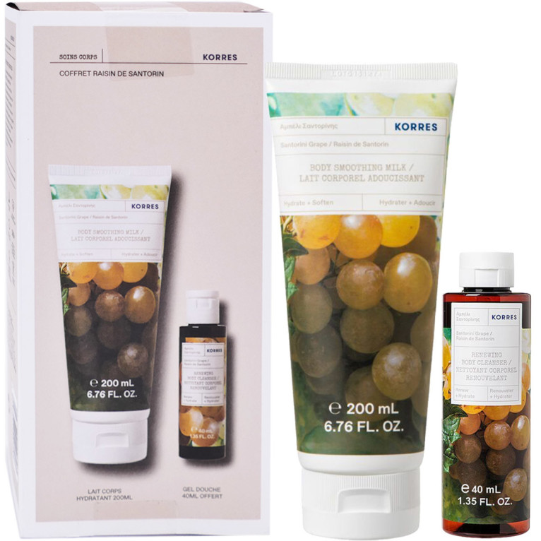 Le Coffret « Raisin de Santorin » discount de KORRES, une fragrance fraîche et fruitée dans votre parapharmacie en ligne, dans un Nettoyant Corporel au Raisin de Santorin (40ml) et un Lait Corps Velouté Hydratant au Raisin de Santorin (200ml).