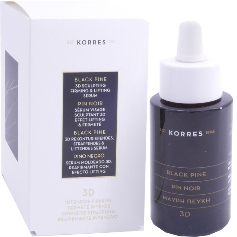 Les soins Lift-fermeté de KORRES composés d’ingrédients naturels à base de pin noir et de quercétine & chêne sont idéals pour combattre les signes de l’âge installés et préserver la peau de sa jeunesse. Le Sérum Visage 3D Pin noir de KORRES est un soin est à base d’extraits végétaux (pin noir, avoine, colza), d’acide hyaluronique et d’exapeptide 11. Il va raffermir, sculpter et lisser le visage, et redessiner l’ovale. Le Sérum va lutter contre le vieillissement prématuré des cellules de l’épiderme et de l’apparition des rides et ridules sur le visage en diminuant celles déjà présentes, raffermir pour lutter contre le relâchement cutané, protéger les cellules cutanées et les renouveler, hydrater intensément et en profondeur pour lutter contre le dessèchement cutané, redessiner l’ovale du visage, renforcer la barrière cutanée pour mieux lutter contre les signes de l’âge, et redonner de l’élasticité et de la souplesse à la peau avec un effet lifting et un teint lumineux. Sa texture ultra-légère non grasse qui pénètre rapidement à l’application, laisse la peau très douce après le soin et parfumé. Jour après jour, le visage retrouve son éclat, la peau est plus ferme, plus lisse et éclatante de beauté.