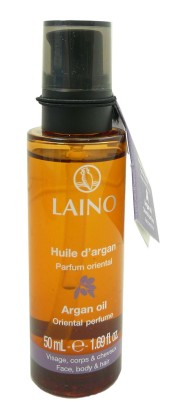 Depuis 1953, la marque LAINO fidèle à ses engagements d’authenticité et naturalité, développe des produits cosmétiques sûrs, efficaces, composés d’ingrédients naturels, simples et traditionnels : argile, pierre d’alun, huile d’olive, savon de Marseille, huile d’amande douce… L’huile d’argan parfum oriental de LAINO est un véritable secret de beauté venu d’Orient aux multiples vertus : elle nourrit la peau et les cheveux, préserve la jeunesse de l’épiderme, illumine le teint et enveloppe le corps d’un parfum chaleureux et sensuel aux notes orientales … L’huile d’argan est très riche en acides gras essentiels, en vitamine E et polyphénol aux incroyables pouvoirs antioxydants. Sans paraben, sans phénoxyéthanol, sans huile minérale, hypoallergénique.