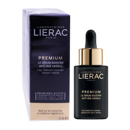 LIERAC est la première marque française dermo-cosmétique spécialisée dans la correction du vieillissement et des désordres cutanés, et instauratrice de la « cosmétique technique » qui allie plaisir des sens et efficacité. La gamme PREMIUM est constituée de soins anti-âge d’exception, aux galéniques sensorielles, inspirés de la médecine régénérative et développés pour apporter une réponse efficace aux signes du vieillissement cutané : rides, perte de densité, relâchement, teint irrégulier... PREMIUM Sérum Booster Anti-âge Absolu de LIERAC, à la texture fondante, est spécialement conçu pour relancer le processus de régénération cellulaire et corriger de façon globale les signes de l’âge : les rides s’atténuent, le teint s’éclaire, les taches sont moins visibles, la peau est raffermie et son grain est affiné. Sa composition associe des actifs ultra performants : des extraits de fleurs noires rares (orchidée noire, rose Black Baccara, pavot noir) antioxydants, de l’acide hyaluronique pur dosé à 10% et des microsphères végétales brevetées capables de régénérer l’ADN au coeur même des cellules. Résultats visibles en 4 semaines. Testé sous contrôle dermatologique - Non comédogène - Sans paraben