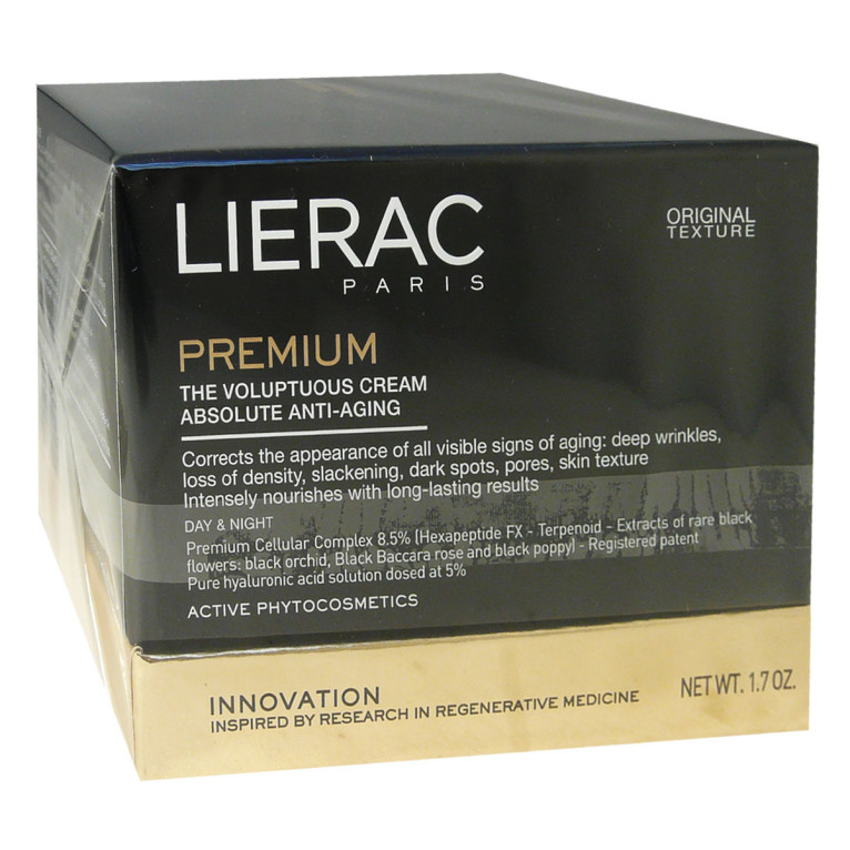 LIERAC est la première marque française dermo-cosmétique spécialisée dans la correction du vieillissement et des désordres cutanés, et instauratrice de la « cosmétique technique » qui allie plaisir des sens et efficacité. La gamme PREMIUM est constituée de soins anti-âge d’exception, aux galéniques sensorielles, inspirés de la médecine régénérative et développés pour apporter une réponse efficace aux signes du vieillissement cutané : rides, perte de densité, relâchement, teint irrégulier... PREMIUM la crème voluptueuse de LIERAC, à la texture onctueuse et fondante pour un fini velouté, est spécialement conçue pour nourrir, réconforter la peau et corriger de façon globale les signes de l’âge : les rides s’atténuent, le teint s’éclaire, les taches sont moins visibles, la peau est raffermie et son grain est affiné. Sa composition associe des actifs ultra performants : le complexe Premium Cellular breveté LIERAC dosé à 8,5% : Hexapeptide FX, Terpenoïde, extraits de fleurs noires rares (orchidée noire, rose Black Baccara, pavot noir), de l’acide hyaluronique pur dosé à 5% et un concentré nutritif dosé à 20 %. Résultats visibles en 4 semaines. Testé sous contrôle dermatologique, non-comédogène, sans paraben.