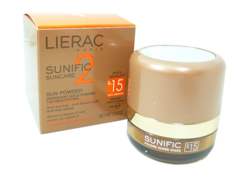 LIERAC est la première marque française dermo-cosmétique spécialisée dans la correction du vieillissement et des désordres cutanés, et instauratrice de la « cosmétique technique » qui allie plaisir des sens et efficacité. La gamme solaire SUNIFIC 1, 2, 3 est constituée de soins aux textures délicieuses, développés pour offrir une triple performance antirides, anti-élastose et anti-taches associée à une protection UVA/UVB intense pour toutes les adoratrices du soleil. SUNIFIC 2 Poudre dorée irisée SPF15 de LIERAC, conditionnée en poudrier pompon applicateur avec miroir intégré, est spécialement conçue pour protéger, corriger les signes du vieillissement solaire et sublimer le bronzage en un geste très féminin. Sa formule est composée d’un système filtrant anti-UVA/UVB 100% minéral haute performance, et d’un complexe anti-âge/ activateur de bronzage associant extrait de noni, vitamine E et huile de roucou.