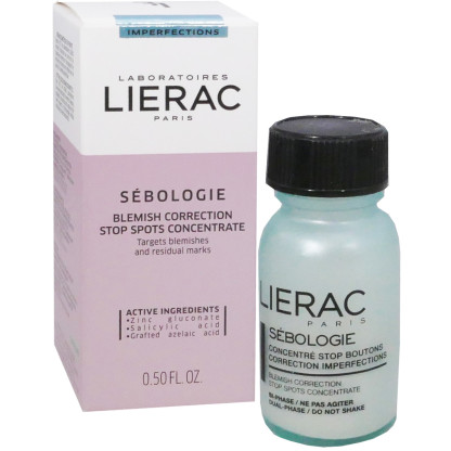 LIERAC est la première marque française dermo-cosmétique spécialisée dans la correction du vieillissement et des désordres cutanés, et instauratrice de la « cosmétique technique » qui allie plaisir des sens et efficacité. La gamme SEBIOLOGIE est constituée de soins anti-imperfections, aux galéniques sensorielles, inspirés de la technique esthétique du resurfacing assainissant développés pour apporter une réponse efficace aux problèmes de peaux à imperfections : boutons, pores dilatées, brillance de la peau,… Concentré Stop Boutons SEBOLOGIE est un soin très concentré et ciblé composé de gluconate de zinc, d’actif dermatologiques kératolytiques (acide salicylique), d’acide azélaïque greffé et de poudre de calamine. Il va éliminer le sébum en excès de l'épiderme en resserrant les pores tout en le régulant pour lutter contre la réapparition de l'acné (comédons, boutons noirs,…) en éliminant la bactérie responsable de la formation des boutons, purifier et assainir la peau, et stimuler le renouvellement des cellules par son action peeling resurfacing aux propriétés assainissantes et exfoliantes, agir sur les boutons et les marques résiduelles, et matifier pour éliminer les zones de brillance. Sa texture bi-phase (poudre et liquide) laisse la peau purifiée instantanément. Après le soin la peau est nette, purifiée et matifiée. En 30 jours, les boutons et marques résiduelles ont diminués et les pores sont désincrustés.