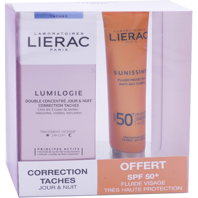 ILe coffret LUMILOGIE et SUNISSIME de LIERAC discount, le pouvoir de la cosmétique technique dans votre parapharmacie en ligne à prix discount, dans 2 soins visage conçu pour agir sur les taches de la peau jour et nuit, et sa protection : Lumilogie Double Concentré Jour & Nuit (30ml) et Sunissime Fluide Protecteur Energisant Anti-âge Global SPF50 (40ml) offert.