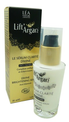 Lift’Argan développe des soins cosmétiques naturels à base d’huile d’argan biologique, ingrédient aux incomparables bienfaits sur la peau. Riche en acides gras essentiels, vitamine A et E, l’huile d’Argan au puissant pouvoir antioxydant, permet de lutter efficacement et naturellement contre le vieillissement cutané. Le sérum Clarté Divine de Lift’ Argan, composé d’un complexe unifiant et éclaircissant exclusif, est un soin spécialement conçu pour réduire significativement les taches pigmentaires, prévenir leur réapparition, unifier et illuminer la peau. Indiqué aussi bien pour le visage, le décolleté ou les mains.