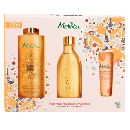 Le premier produit de ce rituel est Melvita L'Or Bio Huile Extraordinaire 50 ml : Une huile sèche satinée pour corps, visage et cheveux, nourrissant intensément et embellissant la peau. Contient cinq huiles bio rares : huile du Maroc, de kendi d'Indonésie, d'inca inchi d'Amazonie, de dattier du désert du Burkina et de Baobab d'Afrique. Pénètre rapidement, laissant une peau satinée et des cheveux doux et brillants.