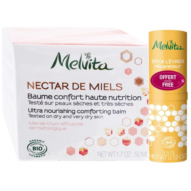 Le Lot Nectar de Miels discount de MELVITA, toute la beauté de la nature réunis dans 2 soins réunissant 3 miels bio, conçus pour réparer et réconforter les lèvres et la peau, dans votre parapharmacie en ligne à prix discount. Lèvres sèches, visage.Baume Confort Haute Nutrition Bio (50ml) + Stick Lèvres Réparateur Bio (3,5g) Offert