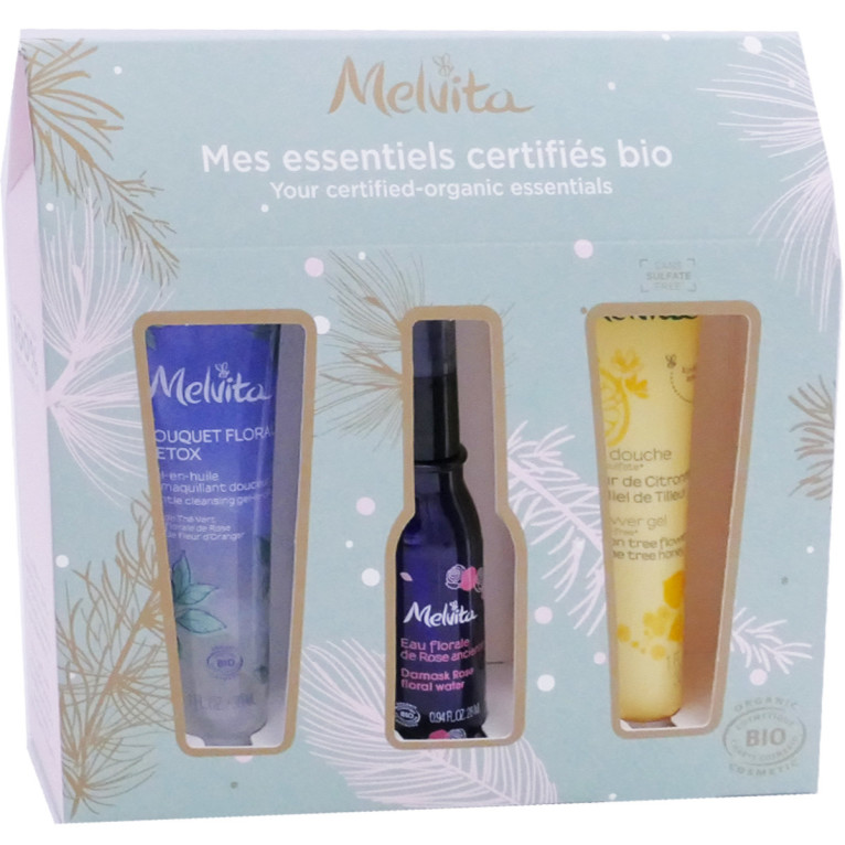 Le Coffret « Mes essentiels Certifié Bio » discount de MELVITA, toute la beauté de la nature dans 3 soins douceur petit format pour être transporté partout avec soi dans votre parapharmacie en ligne à prix discount, essentiels au soin quotidien du visage : Bouquet Floral Détox Gel -en-huile démaquillant (30ml) ; Eau florale de Rose ancienne (28ml) ; Gel douche Fleur de citronnier et Miel de tilleul (30ml). Visage, yeux, corps