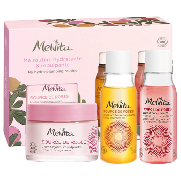 Le Coffret « Ma Routine Hydratante & Repulpante » discount de MELVITA, toute la beauté de la nature dans 3 soins à la rose sauvage, pour une routine hydratante et fraîche quotidienne : Crème Hydra-Repulpante Source de Roses (50ml) Essence Hydra-Repulpante Source de Roses (30ml) Huile lactée démaquillante Source de Roses (30ml), dans votre parapharmacie en ligne à prix discount.