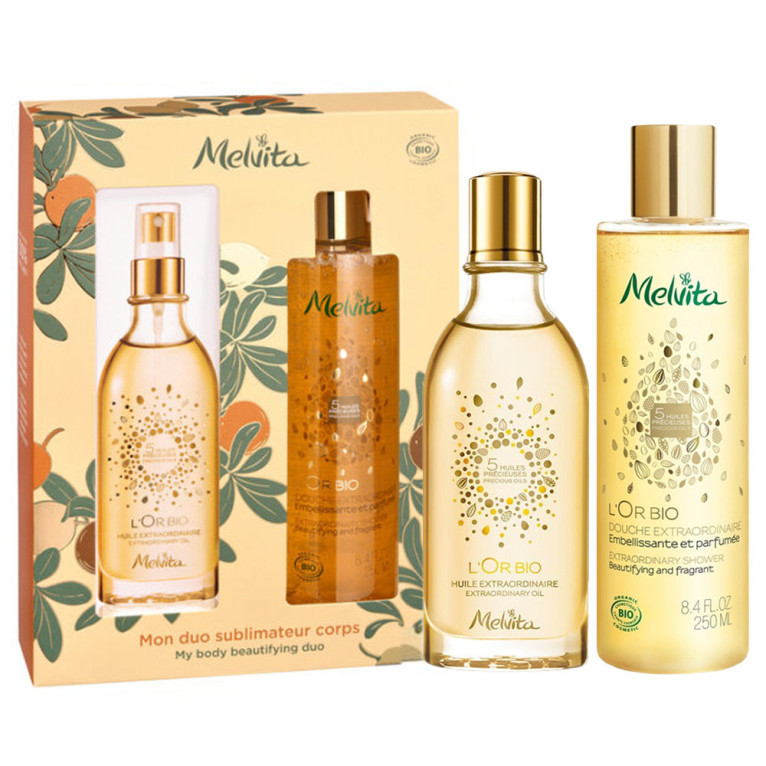 Le Coffret « Mon Duo Sublimateur Corps » discount de MELVITA, toute la beauté de la nature dans 2 soins douceur aux huiles rares biologiques dans votre parapharmacie en ligne à prix discount, pour sublimer le corps et le visage : Huile extraordinaire l’Or Bio (100ml) ; Douche Extraordinaire l’Or Bio (250ml)