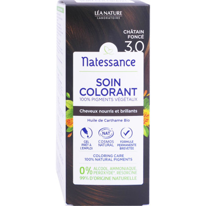 Soin Colorant discount de NATESSANCE, la coloration naturelle 100% végétale dans votre parapharmacie en ligne à prix discount, qui offre soin et reflets intenses aux cheveux, protection et douceur aux cuirs chevelus les plus sensibles. 3.0 Châtain Foncé.
