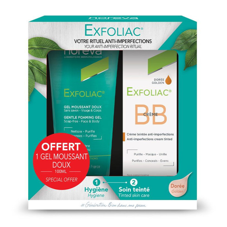 Le coffret EXFOLIAC discount de NOREVA, est un lot de 2 soins pour un rituel anti-imperfections et retrouver une peau zéro défaut : BB Crème Dorée (30ml) et Gel Moussant Doux Exfoliac (100ml) Offert Visage. A prix discount dans votre parapharmacie en ligne
