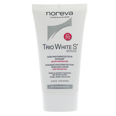Les laboratoires NOREVA développent des soins dermo-cosmétiques qui allient performance, tolérance et innovation galénique, adaptés à tous les types de peau et offrant une réponse ciblée à chaque besoin cutané. La gamme TRIO WHITE est spécialement conçue pour apporter des solutions mélano-désactivatrices en proposant des soins formulés pour corriger les taches existantes, prévenir l’apparition de nouvelles taches et unifier le teint. Le soin photoprotecteur intensif Trio White S de NOREVA est composé du complexe Melawhite qui est un actif puissant, et d’écrans et filtres solaires anti UVA/UVB (SPF50) qui atténue les taches pigmentaires déjà présentes et protège de l’exposition au soleil, régule la production de la mélanine naturellement présente dans la peau, et élimine la quantité en excès pour limiter l’apparition de nouvelle taches.Sa texture fluide qui pénètre rapidement à l’application en fait un soin agréable.