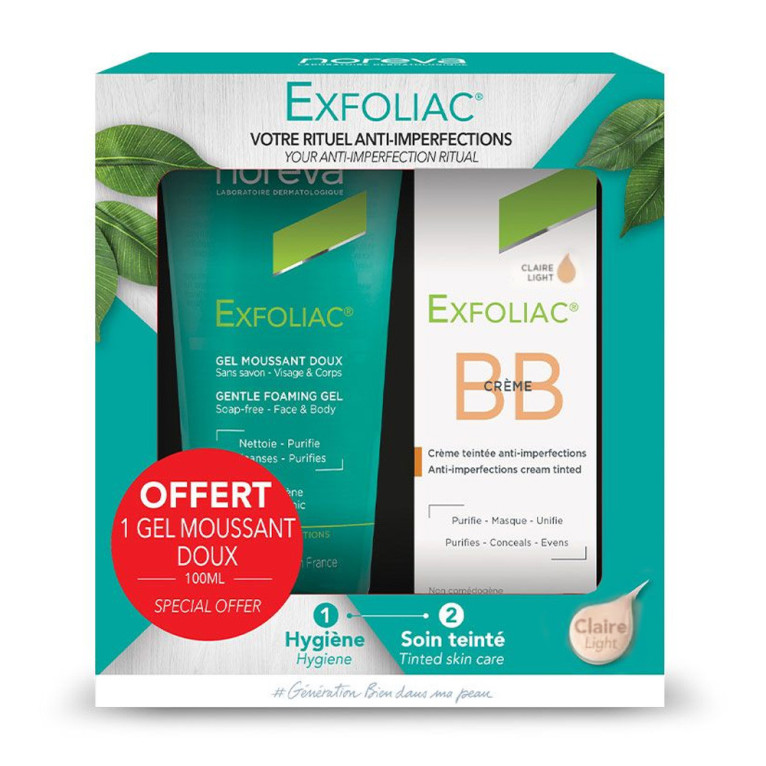 Le coffret EXFOLIAC discount de NOREVA, est un lot de 2 soins pour un rituel anti-imperfections et retrouver une peau zéro défaut : BB Crème Claire (30ml) et Gel Moussant Doux Exfoliac (100ml) Offert Visage. A prix discount dans votre parapharmacie en ligne