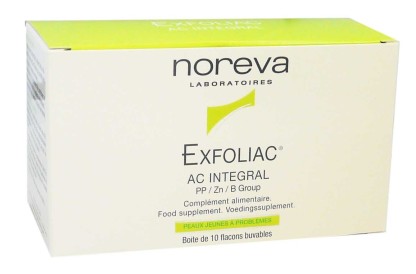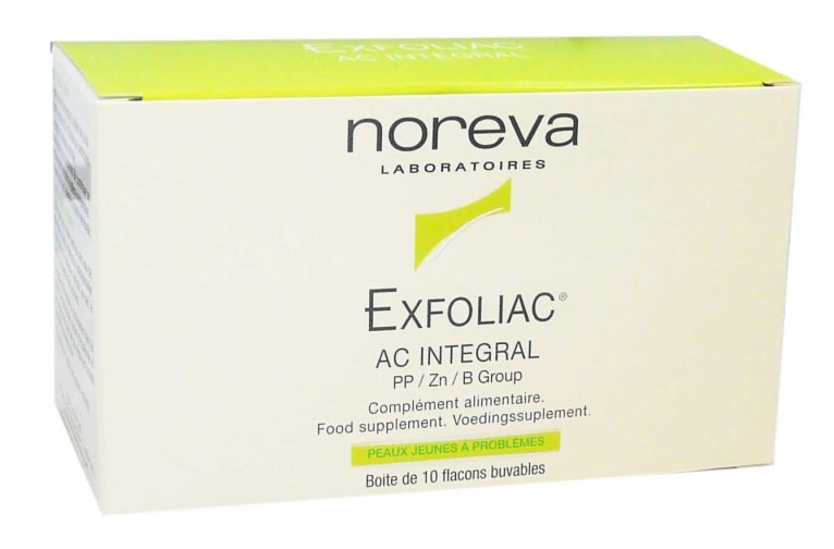 La gamme EXFOLIAC des laboratoires NOREVA apporte une réponse aux peaux jeunes à tendance acnéique modérée à sévère en proposant des soins anti-imperfections et anti-récidive. EXFOLIAC AC INTEGRAL de NOREVA est un complément alimentaire sous forme de flacons à boire, à base de vitamines B2 et PP ainsi que de biotine qui maintien la peau normale pour lutter contre l'apparition des défauts cutanés (points noirs, comédons, boutons blancs,...). La vitamine B6 va également réguler l’activité hormonale et participer au fonctionnement normal du système immunitaire en association avec le zinc. Avec une prise et une utilisation régulière EXFOLIAC AC INTEGRAL, la peau retrouvera sa beauté, elle sera saine. Sans gluten. Peut contenir des traces de lait, soja.