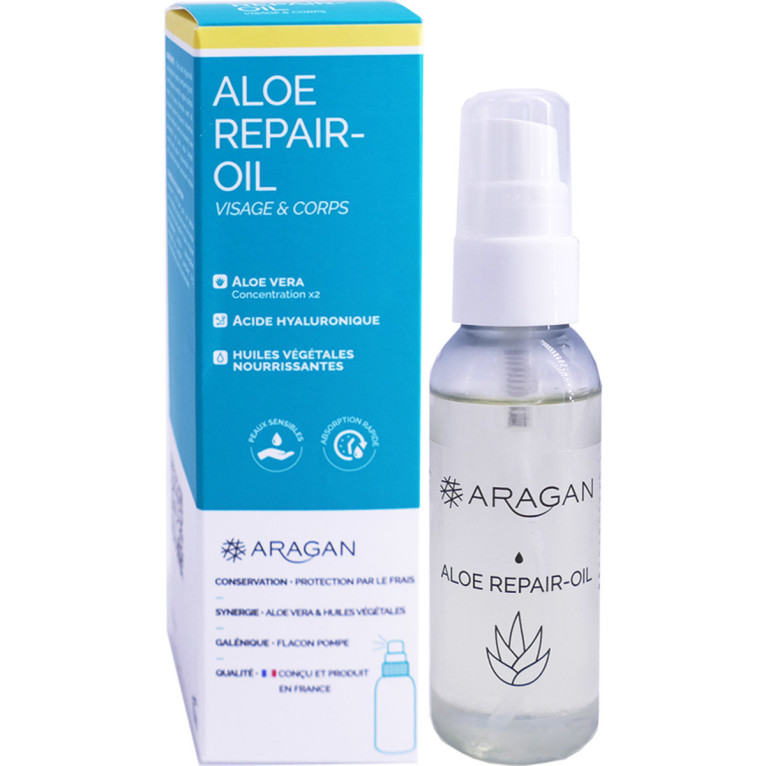 Aloe Repair Oil discount d’ARAGAN, les vertus de l’aloe vera dans votre parapharmacie en ligne à prix discount, pour une huile qui répare et soulage les peaux sensibles, abîmées ou sèches du corps et du visage.