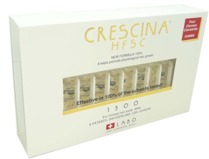 Crescina HSFC 1300 homme de LABO COSPROPHAR, le traitement sous forme de lotion en ampoules qui s’utilise en cas de chute de cheveux physiologique au cuir chevelu très clairsemé à raréfaction importante voir très étendue chez les hommes.